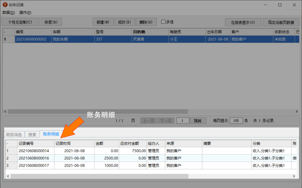 收款金额默认为所有选中的欠款总额,如果实际并未完整收款,您可以修改此框内的数值。